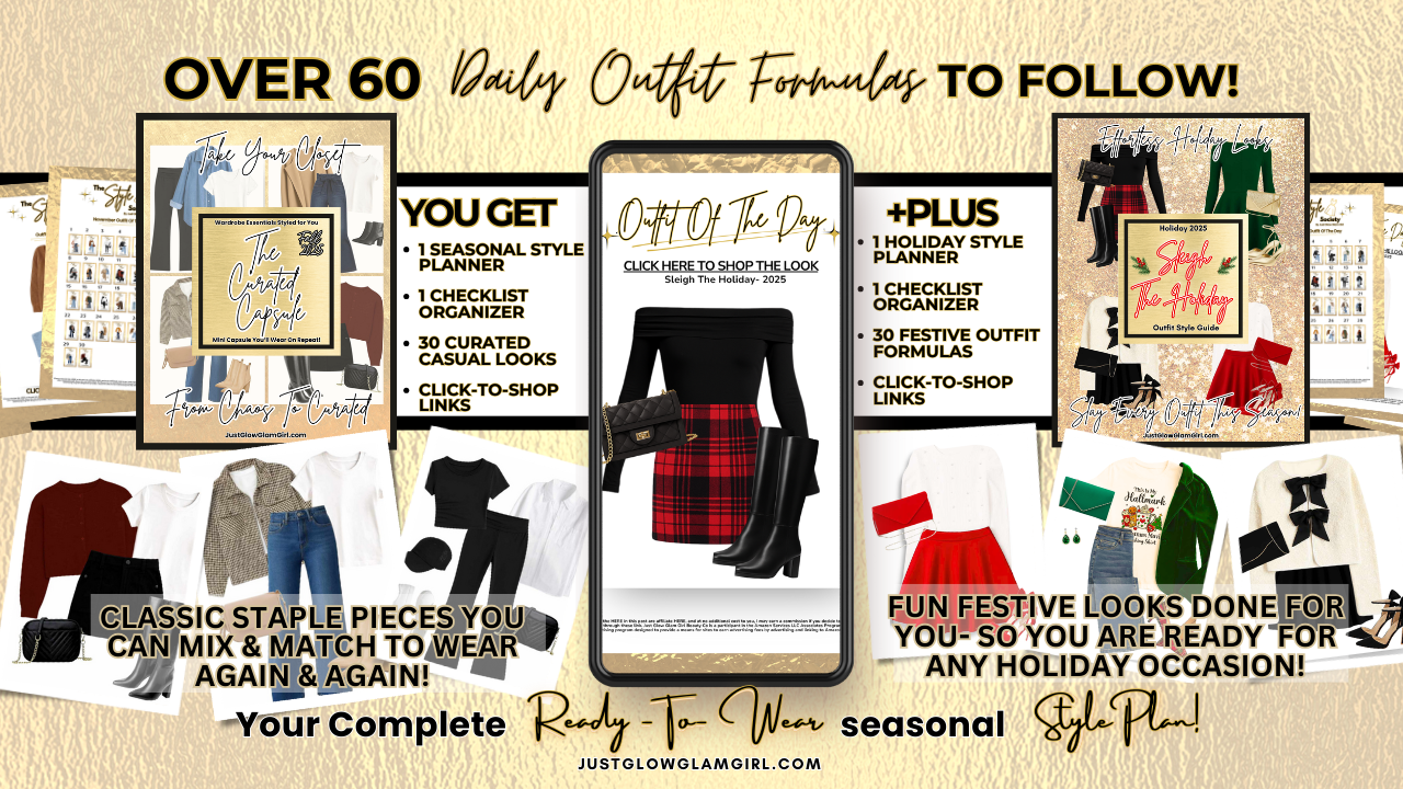 Get TWO Glow Guide Style Planners and follow 60+ Casual Chic & Curated outfit formulas designed to help busy women look instantly put-together for every day and every holiday moment. This is your done-for-you holiday style plan. So You Can Stop Stressing About What to Wear and Focus on Creating The Magic!